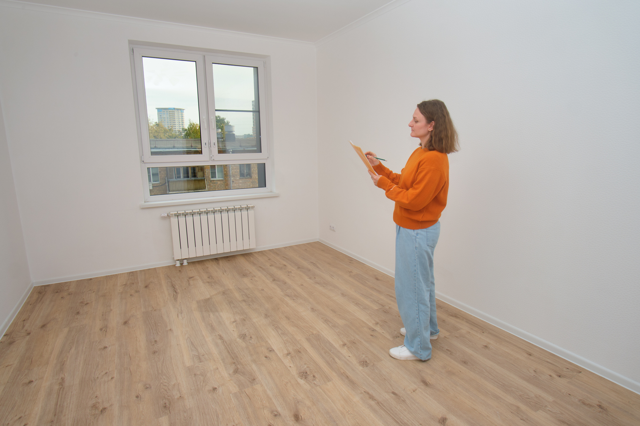 Woman inspecting empty apartment, making notes on a clipboard.